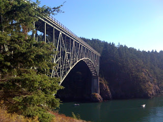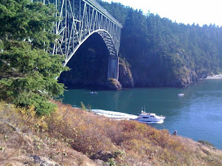 To cut my losses, on the way home I pulled out of the line of motorhomes seeking one last weekend in the wilderness and stopped at Deception Pass. The trails under the bridge are always steep, rocky, dotted with pockets of loose scree and generally not for the faint of heart. Being as I was wearing sandals with heels rather than hiking shoes I didn’t get far from the road, but I did find a little grassy spot atop a rock outcropping and settled in to watch the water.
